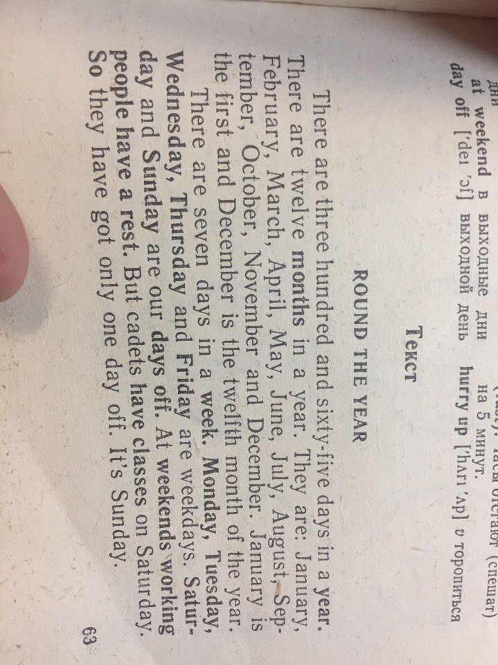 так-же есть 7 дней в неделе. понедельник, вторник, среда ,четверг, пятница рабочие дни. Суббота и воскресенье дни отдыха. В выходные рабочие люди имеют отдых. Но кадеты убираются в классах ( торт субботник) в Субботы. Таким образом они имеют только один выходной - Воскресенье.