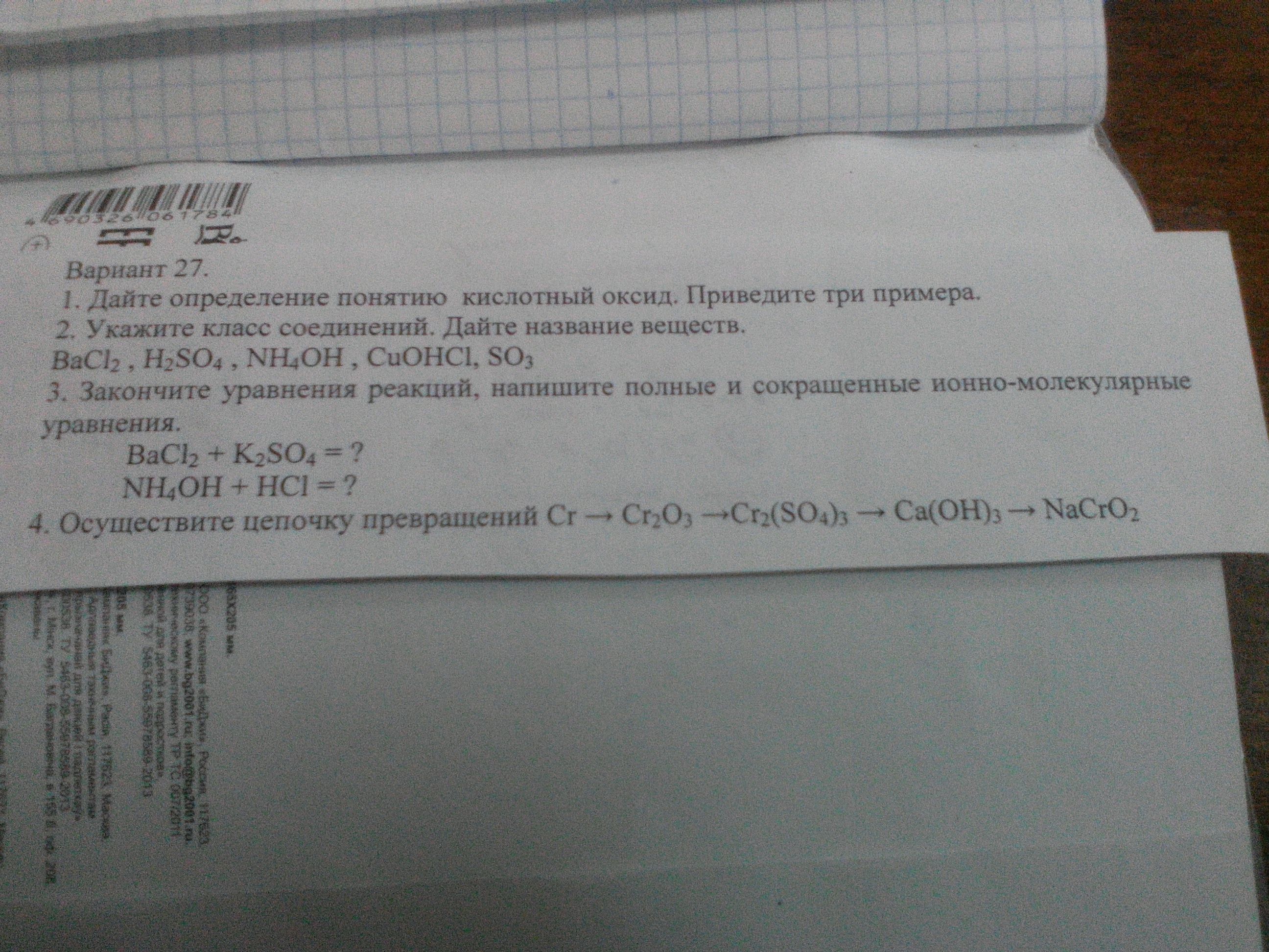 . 2-е задание . 1) BaCl -Класс соли, название хлорид бария. 2)Na2CO4 - Класс кислоты, Серная кислота, 3)NH4OH-Гидра́т аммиа́ка — соединение, образующееся при взаимодействии аммиака с водой и диссоциирующее в воде с образованием катионов аммония и гидроксид-анионов . 4) хлорид гидроксомеди , основные соли , 5) Окси́д се́ры (VI) SO₃ — высший оксид серы, класс оксиды. 3. задание 1) BaCl2 + K2SO4 = BaSO4 + 2KCl