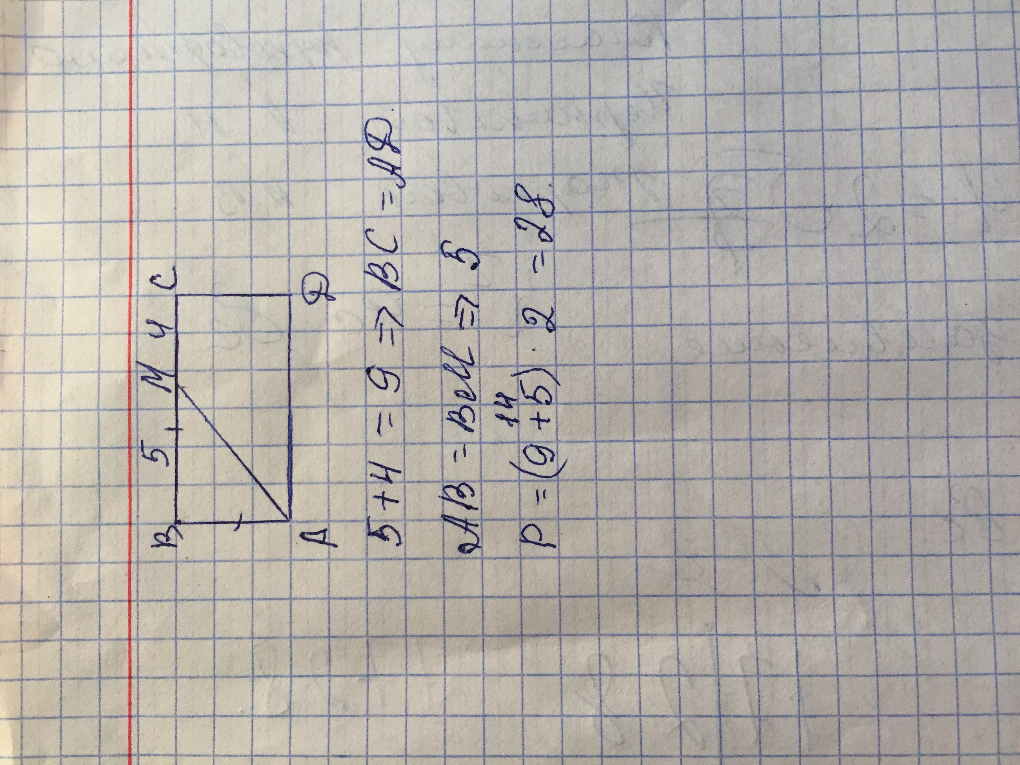 ОЧЕНЬ СРОЧНО!!!!!! Биссектриса угла A прямоугольникаABCD делит сторону BC на отрезки BM = 5 см и MC = 4 см. Найдите периметр прямоугольника ABCD