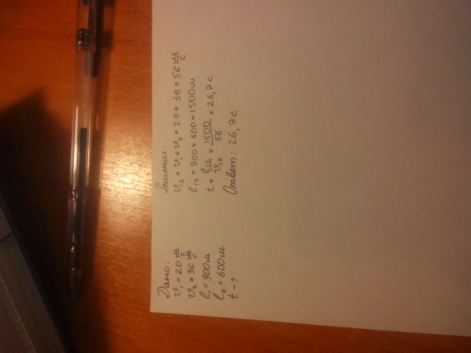 поезд едит 20 м/с ,а на встречу ему по соседнему пути движется другой поезд со скоростью 36 км / ч . сколько времени поезда проезжать мимо друг друга если длина первого поезда равна 900м , а второго 600 м
