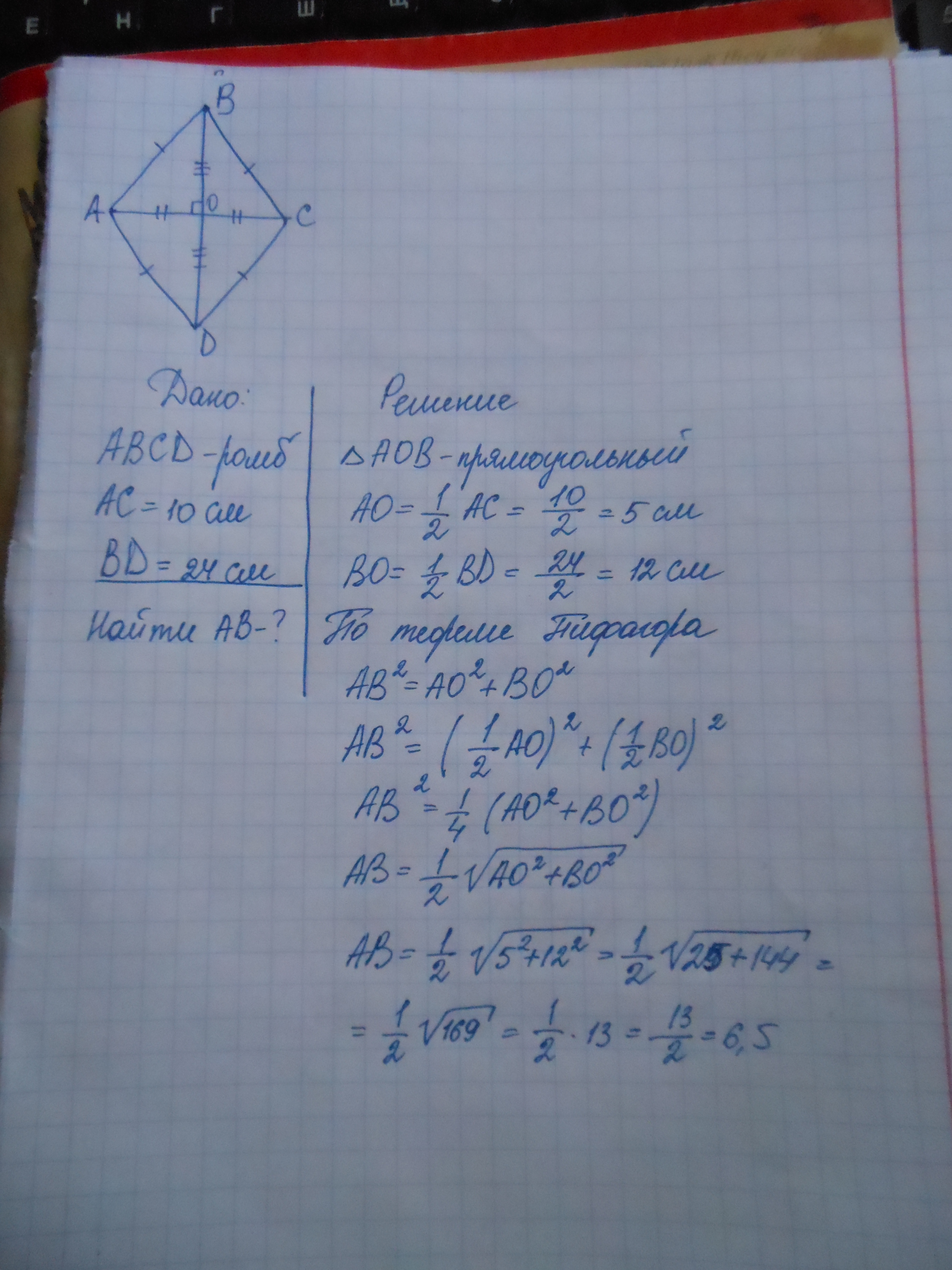 AB=1/2*под корнем AO^2+BO^2