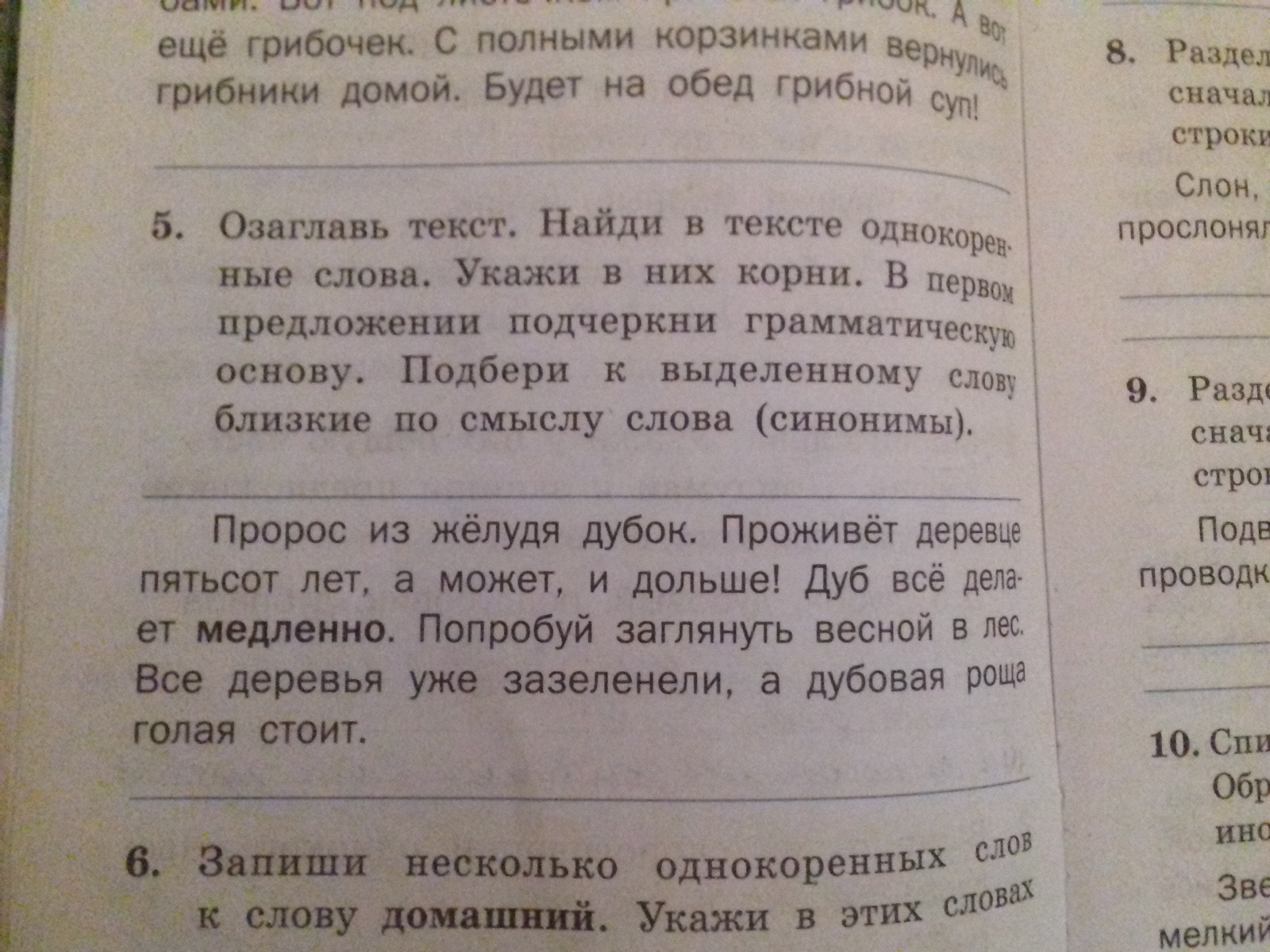 Озаглавь текст найди в тексте однокоренные слова укажи в них корни в первом предложении подчеркни грамматическую основу подбери к выделенному слову близкие по смыслу слова синонимы
