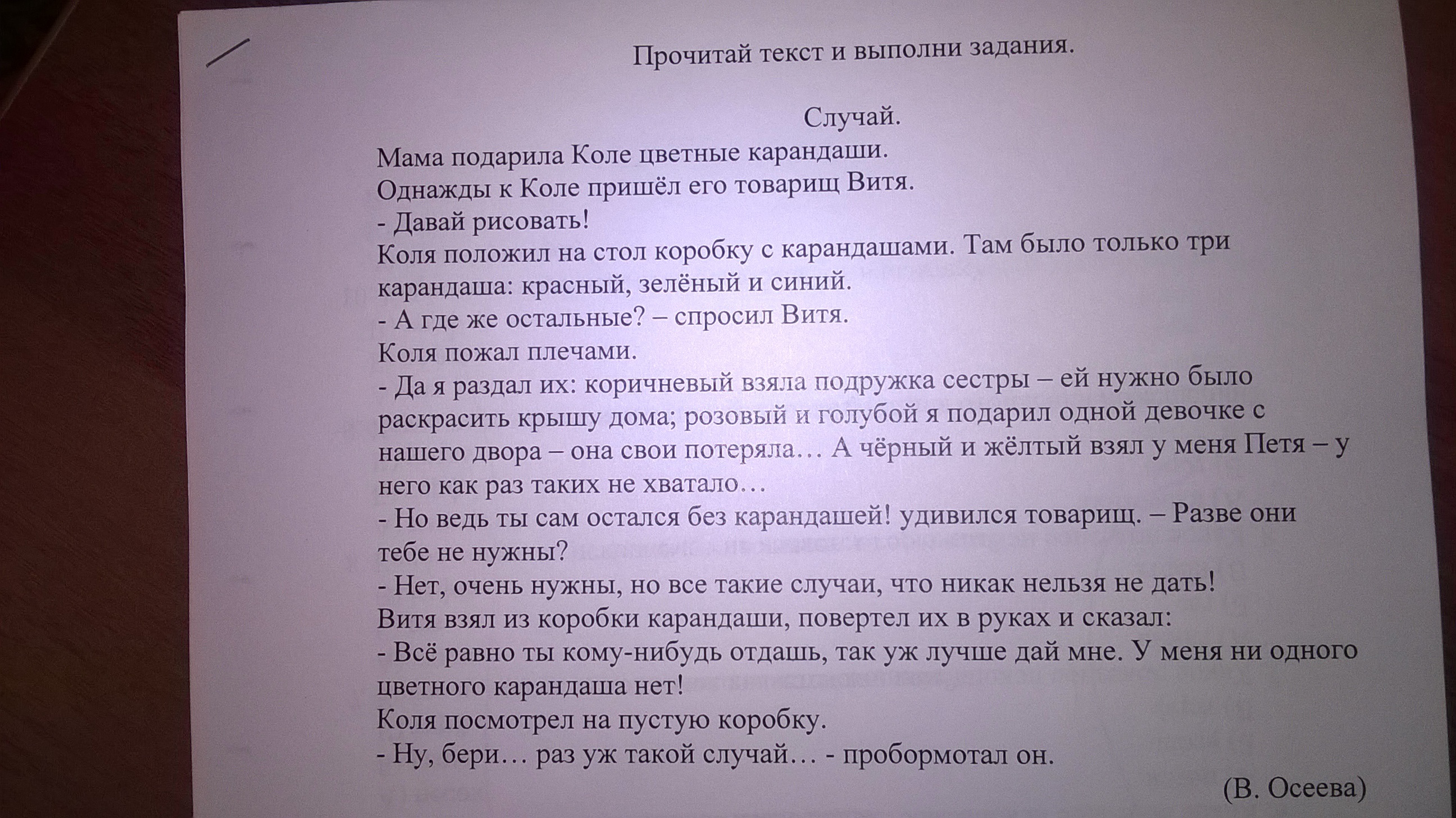 Витя проявил свою жадность забрав все карандаши Коли .А Коля настолько добрый не смог постоять за себя и отказать детям кторым раздал карандаши в том числе и Вите.