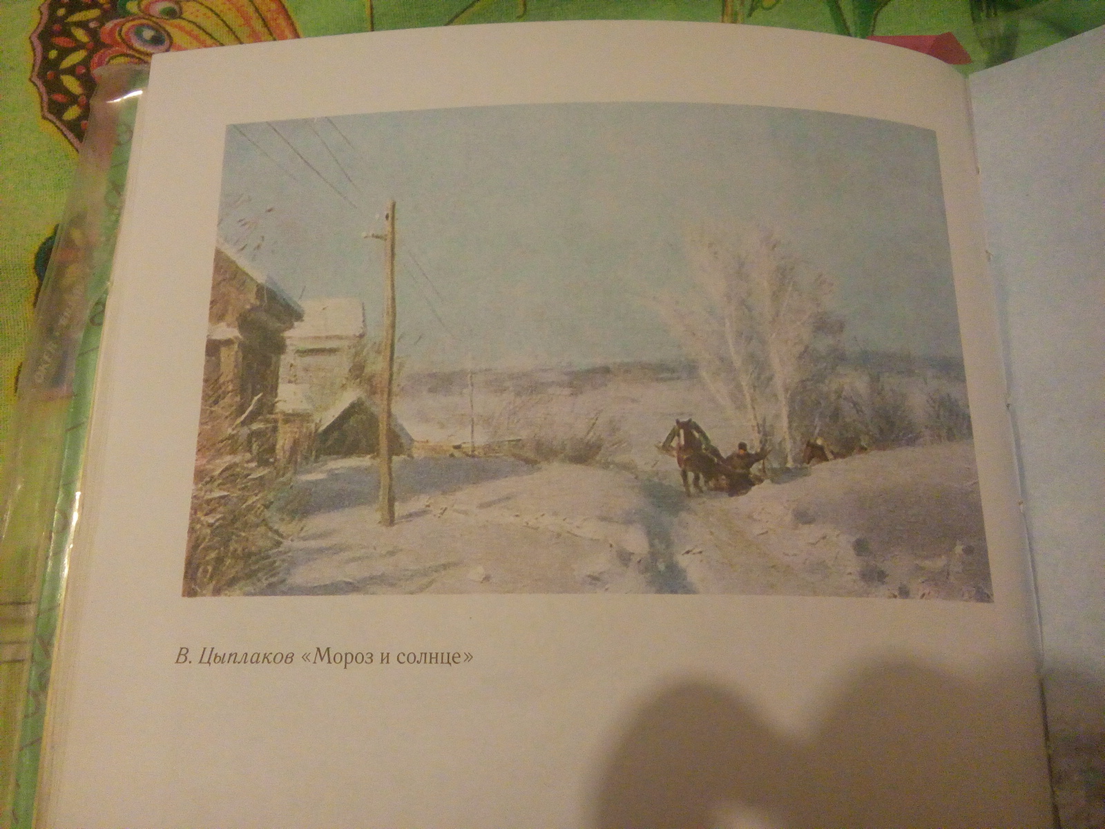 Глядя на картину В.Г.Цыплакова «Мороз и солнце», мы видим зимний пейзаж. На переднем плане картины - голубая земля, белый иней, розово-голубой и светло-лиловый снег и много солнца. Им освещены дома, телеграфные столбы, лошади, люди, поле, лес. Такая палитра создает ощущение праздника, простора, свежести, радости. Мы ощущаем мороз и холод – так много на картине снега.