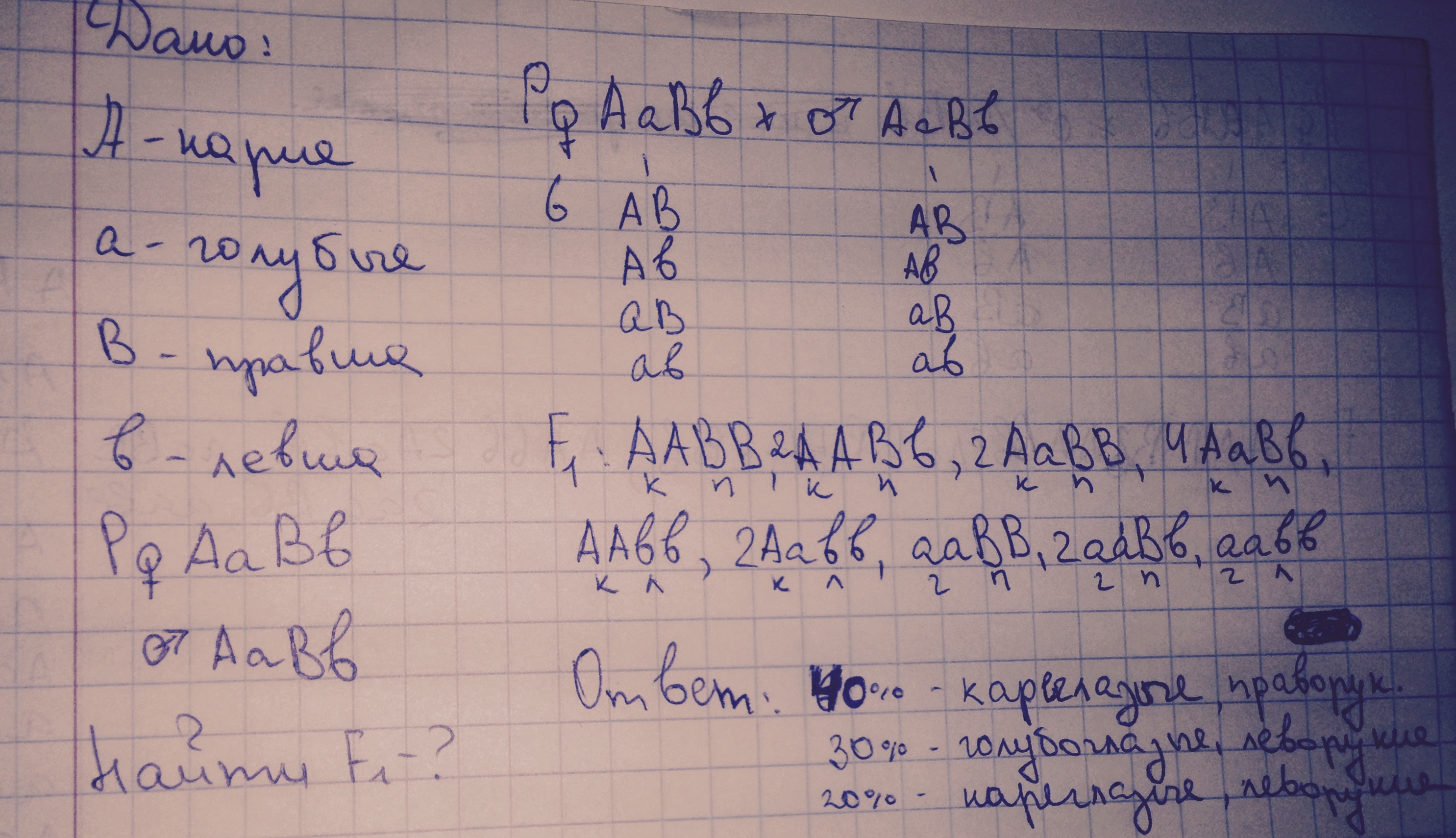 У людини кароокість домінує над блакитним кольором очей. Праворукість над ліворукістю. Гени обох ознак містяться в різних хромосомах. Які ознаки будуть мати діти, якщо їхні батькі - кароокі, праворукі і гетерозиготні за обома ознаками?