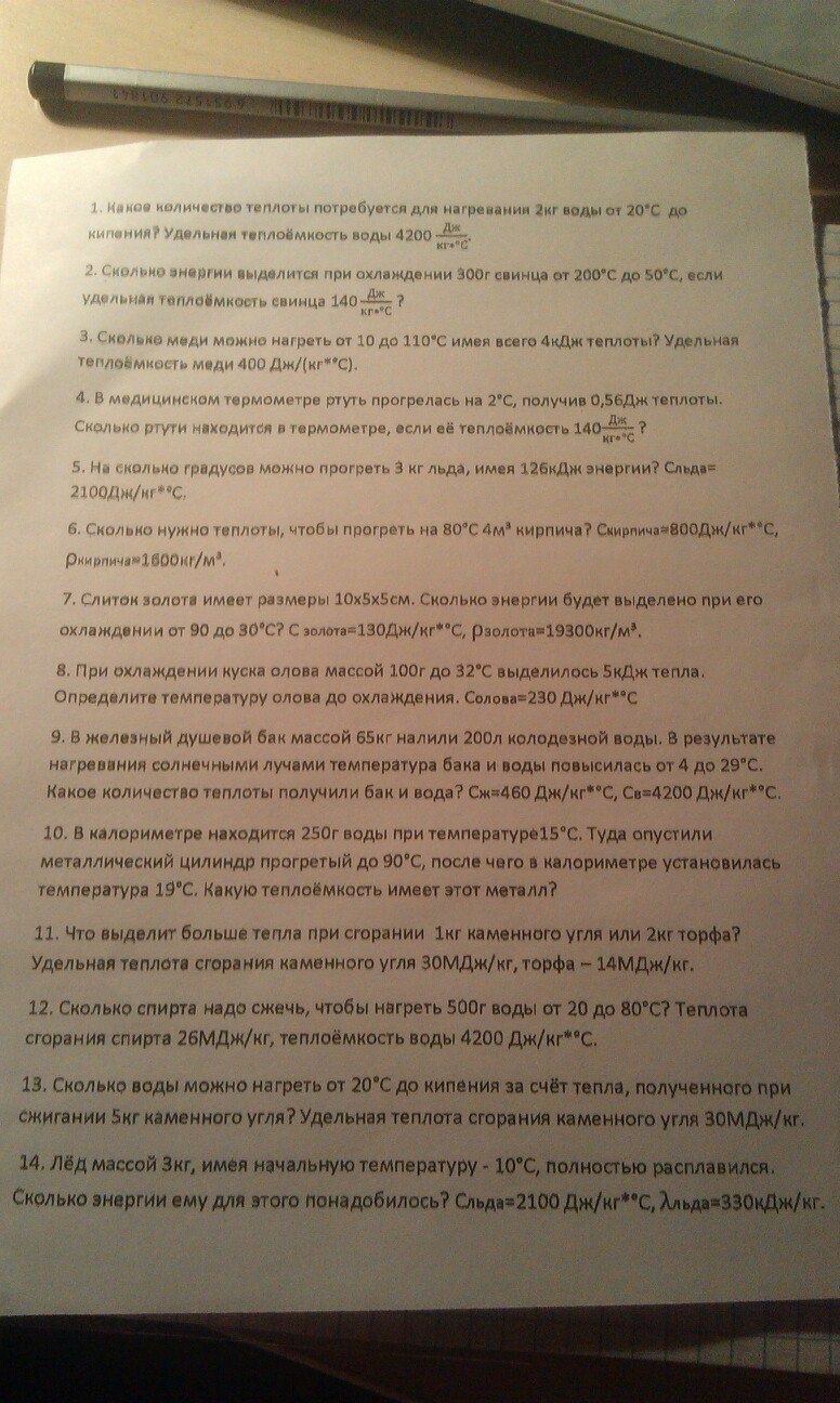 7) Q=c*m*(t2-t1)=Q=c*плотность*V*дельтаt=c*плотность*abh*дельтаt=130дж/кг*градусов Цельсия0,0025м^3*19300кг/м^3*60 градусов Цельсия=376350Дж