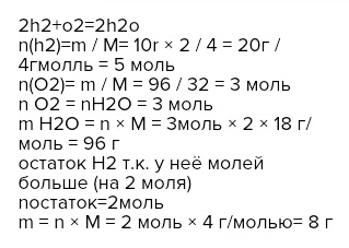 Для сжигания 10 г водорода взяли 96 г кислорода. Вычислите массу образовавшейся воды и массу оставшегося реагента! (Объясните как делать, знаю что задача на избыток и недостаток)