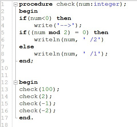 Напишите процедуру,которая получает целое число и выводит его на экран,при этом после четных цифр она дописывает после пробела "/2", после нечетных - "/1", а перед отрицательными ставит набор символов "-->"