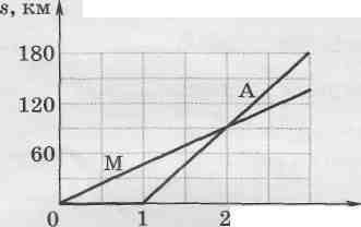 По графику мы видим, что линия "М" начинается от нуля до конца графика достигнув предельного значения часов (в данном графике это 3). По графика так же видно, что две клетки - это 60 км( по графику мы видим, что линяя явно пресекла отметку в 120 километров, но остановилась примерно на середине 1 клетки (если считать от 120).