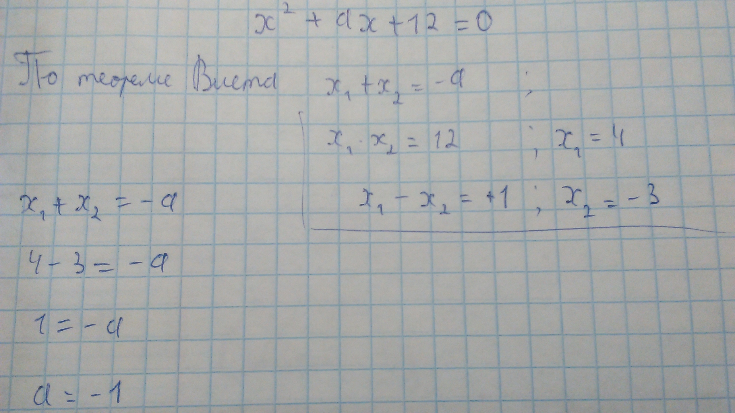 В уравнениях x2+ax+12=0 определите (a) таким образом,чтобы разность корней уравнения равнялась единице.
