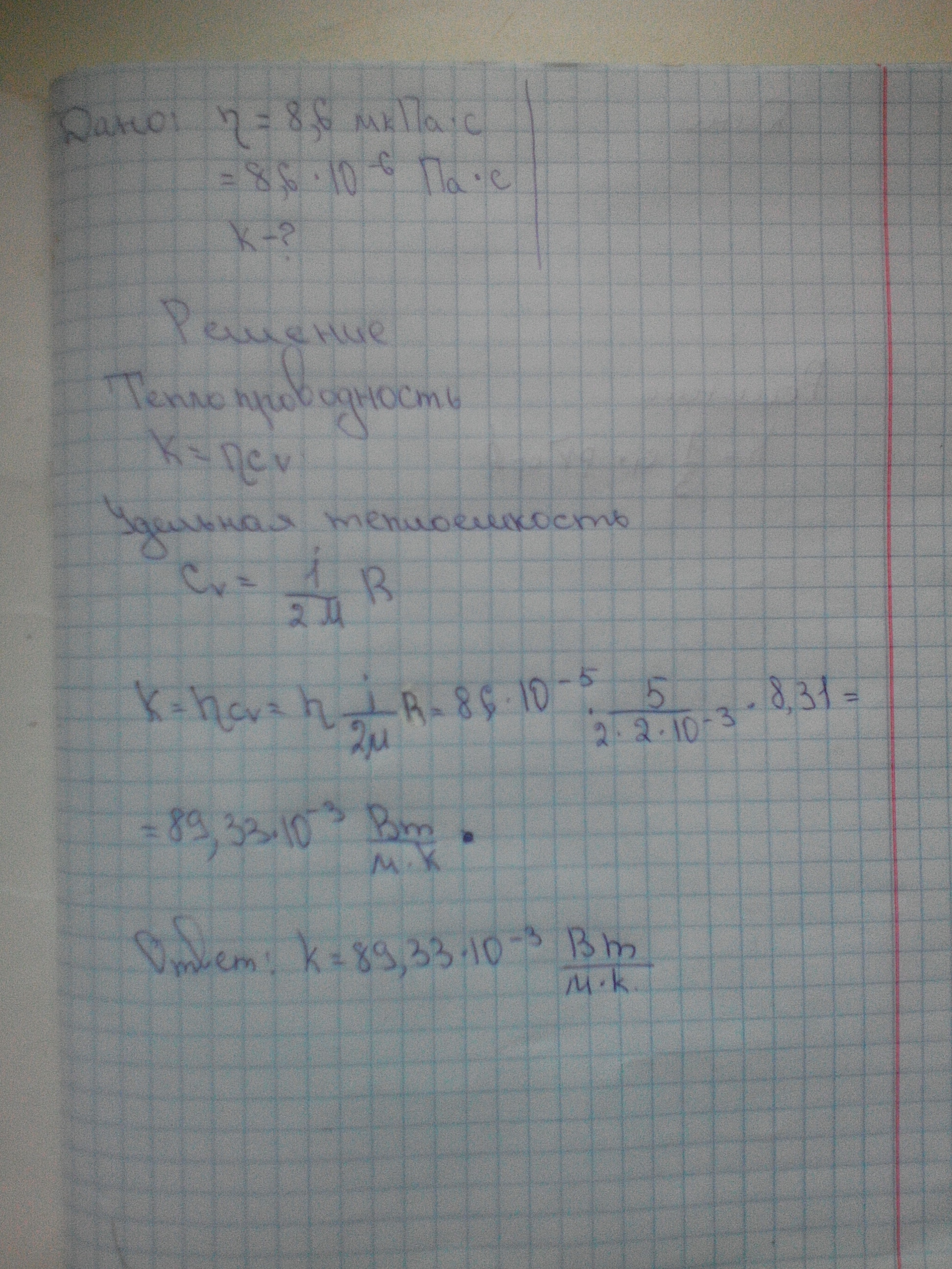 Найти теплопроводность водорода, вязкость которого равна 8.6 мкПа*с