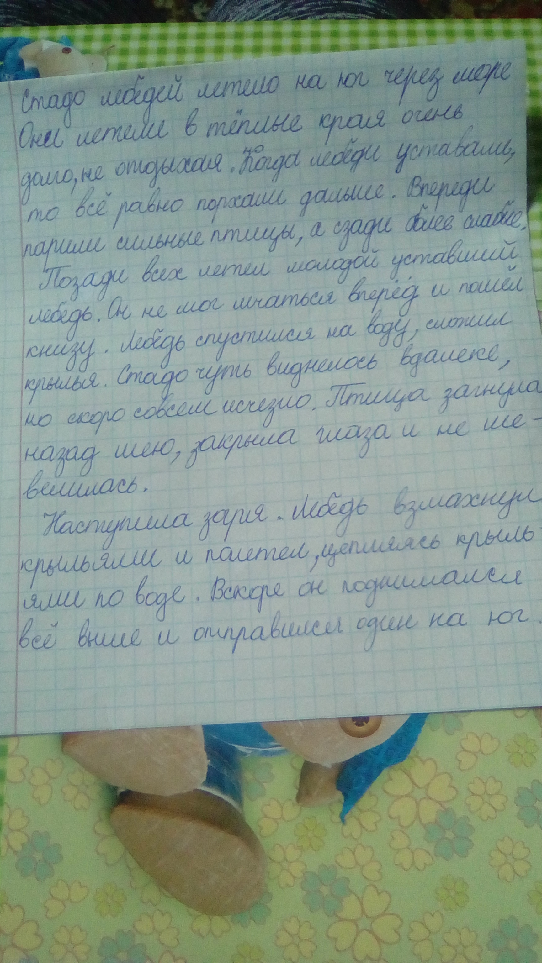Лебеди стадом летели из холодной стороны в тёплые земли. Они летели через море. Они летели день и ночь, и другой день и другую ночь они, не отдыхая, летели над водою. На небе был полный месяц, и лебеди далеко внизу под собой видели синеющую воду. Все лебеди уморились, махая крыльями; но они не останавливались и летели дальше. Впереди летели старые, сильные лебеди, сзади летели те, которые были моложе и слабее. Один молодой лебедь летел позади всех. Силы его ослабели. Он взмахнул крыльями и не мог лететь дальше. Тогда он, распустив крылья, пошёл книзу. Он ближе и ближе спускался к воде; а товарищи его дальше и дальше белелись в месячном свете. Лебедь спустился на воду и сложил крылья. Море всколыхнулось под ним и покачало его. Стадо лебедей чуть виднелось белой чертой на светлом небе. И чуть слышно было в тишине, как звенели их крылья. Когда они совсем скрылись из вида, лебедь загнул назад шею и закрыл глаза. Он не шевелился, и только море, поднимаясь и опускаясь широкой полосой, поднимало и опускало его. Перед зарёй лёгкий ветерок стал колыхать море. И вода плескала в белую грудь лебедя. Лебедь открыл глаза. На востоке краснела заря, и месяц и звёзды стали бледнее. Лебедь вздохнул, вытянул шею и взмахнул крыльями, приподнялся и полетел, цепляя крыльями по воде. Он поднимался выше и выше и полетел один над тёмными всколыхавшимися волнами.