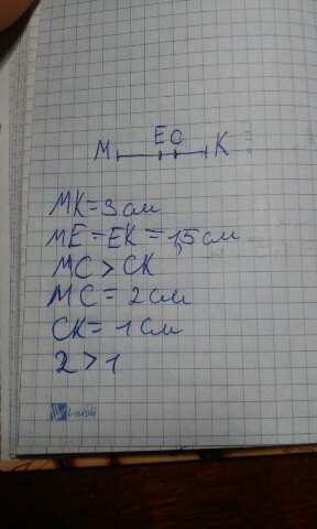 начерти отрезок MK и отметь его середину E. отметь на отрезке MK точку С так. чтобы отрезок MC был больше отрезка CK