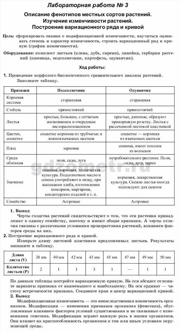 Цель: сформировать знания о модификационной изменчивости, умение описывать растения по фенотипу и сравнивать их между собой.