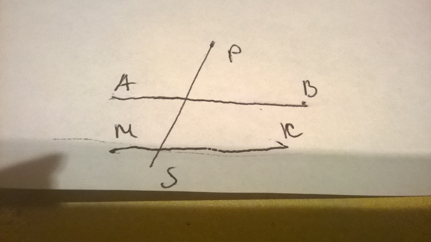 Проведите прямую MK, лучPS и отрезок AB так чтобы луч PS пересекал отрезок AB и прямую MK, а прямая MK не пересекала отрезок AB