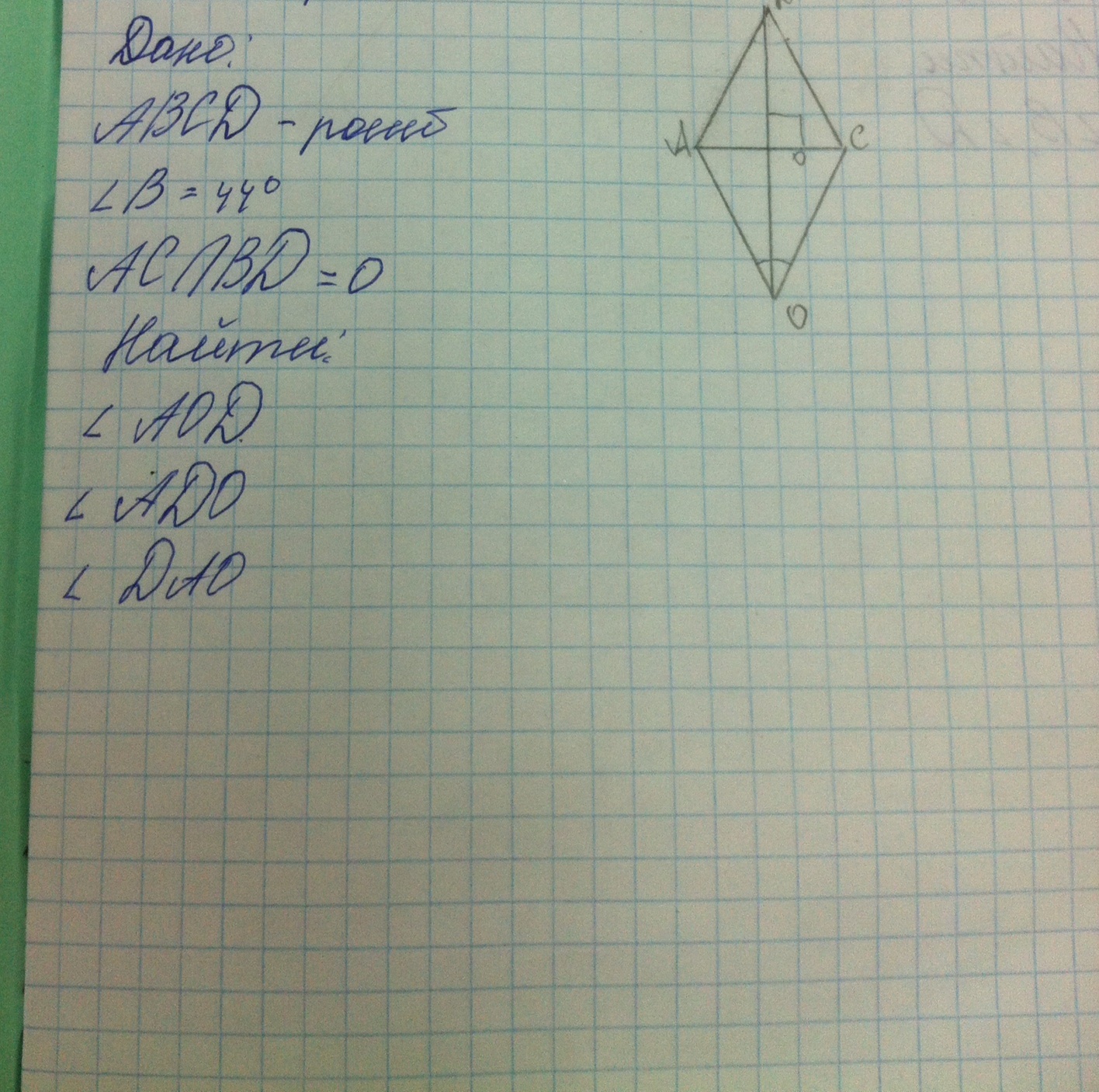 В ромбе, противоположные углы равны ( как и в параллелограмме)- значит угол B равен углу D, Так как В ромбе диагонали перпендикулярны друг другу, то угол AOD=90. В ромбе диагонали являются биссектрисами-значит угол ADO = 1/2 угла D, то есть 44: 2= 22 градуса. А так как в треугольнике сумма углов равна 180 градусам, то получаем , что угол DAO= 180-90-22=68 градусов