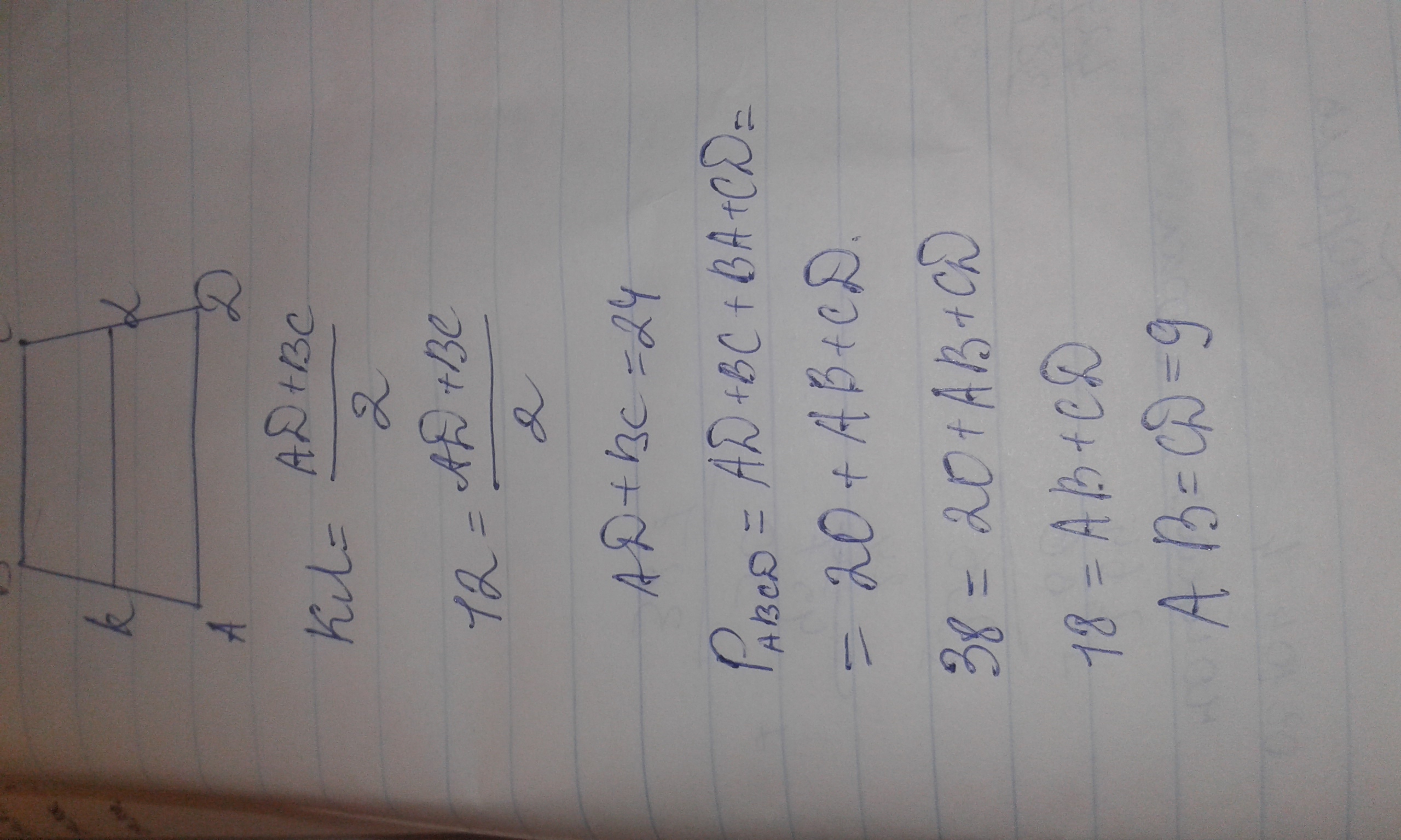 Сначала нужно найти АД+ВС, я потом подставить значение в периметр, ответ поделить по равно.