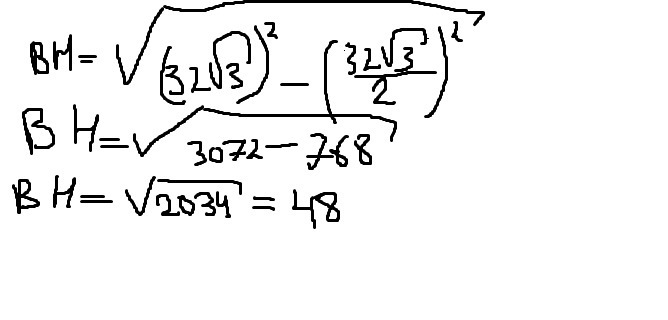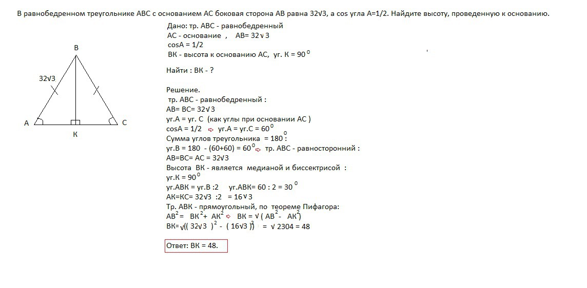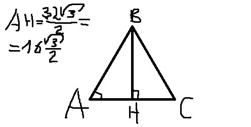 В равнобедренном треугольнике АВС с основанием АС боковая сторона АВ равна 32√3, а cos угла А=1/2. Найдите высоту, проведенную к основанию