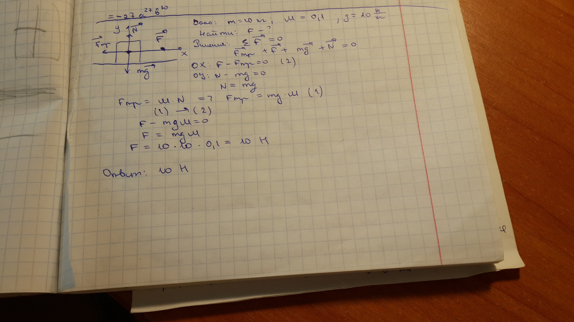 брусок к которому приложена сила F движется по горизонтальной поверхности с постоянной скоростью. найти модуль силы F если масса бруска m=10кг а клэффициент трения M=0.1