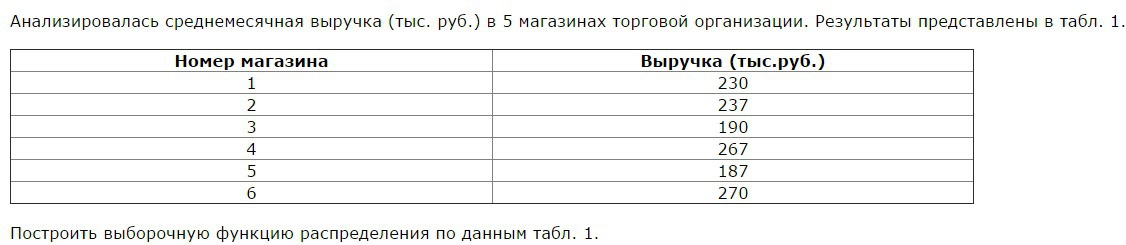 3)Анализировалась среднемесячная выручка (тыс. руб.) в 5 магазинах торговой организации. Результаты представлены в табл. 1.