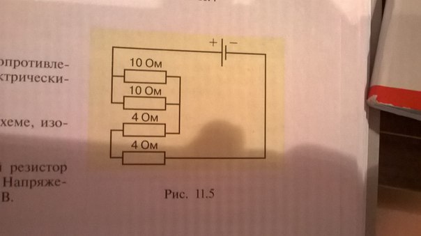 Чему равна сила тока через каждый резистор электрической схемы,изображенной на рисунке 11.5 ? напряжение на выходе источника постоянного тока равна 26 В.