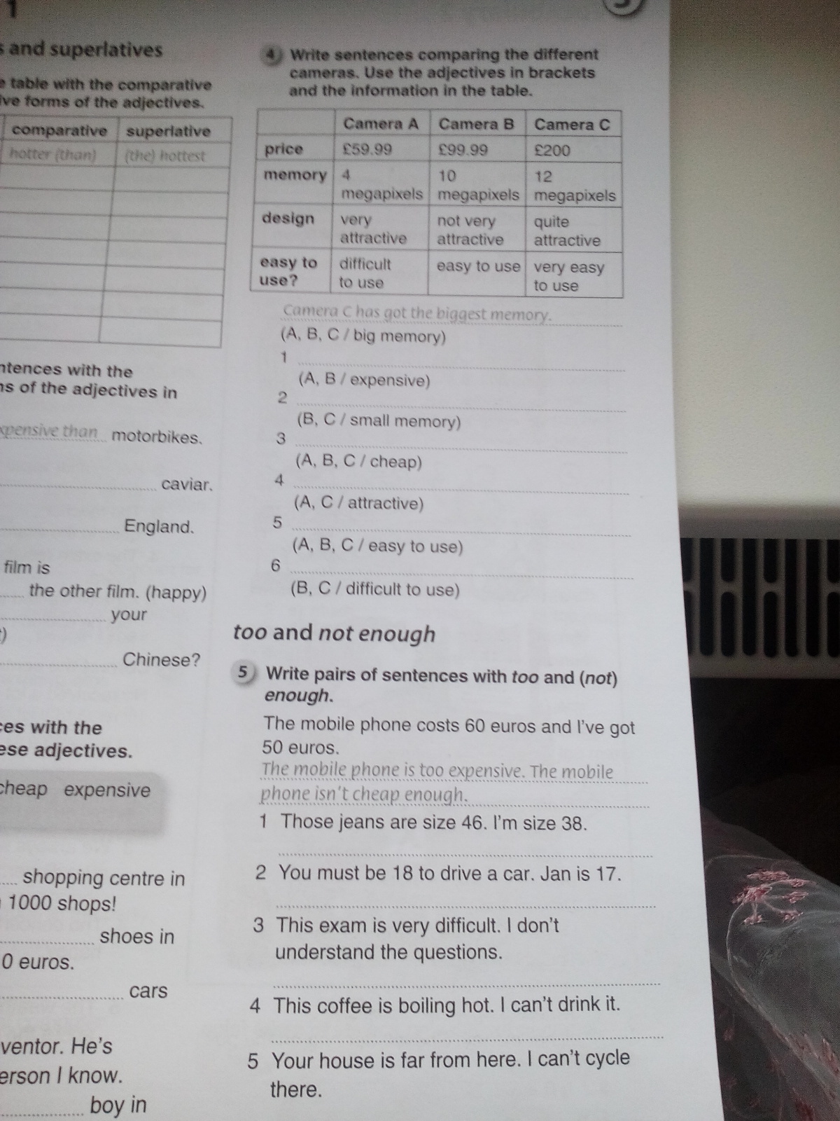 4) 1. Camera B is more expensive than camera A 2. Camera B has got smaller memory than Camera C 3. Camera A is the cheapest 4. Camera A is more attractive than Camera C 5. Camera C is the easiest to use 6. Camera B is more difficult to use than Camera C 5) 1. Those jeans are too big. Those jeans aren't small enough 2. Jan is too young to drive. Jan isn't old enough to drive 3. This exam is too difficult (to understand еще можно добавить думаю) . This exam isn't easy enough (тут так же) 4. This coffee is too hot to drink. This coffee isn't cold enough to drink. 5. Your house is too far to cycle from here. Your house isn't close enough to cycle from here.