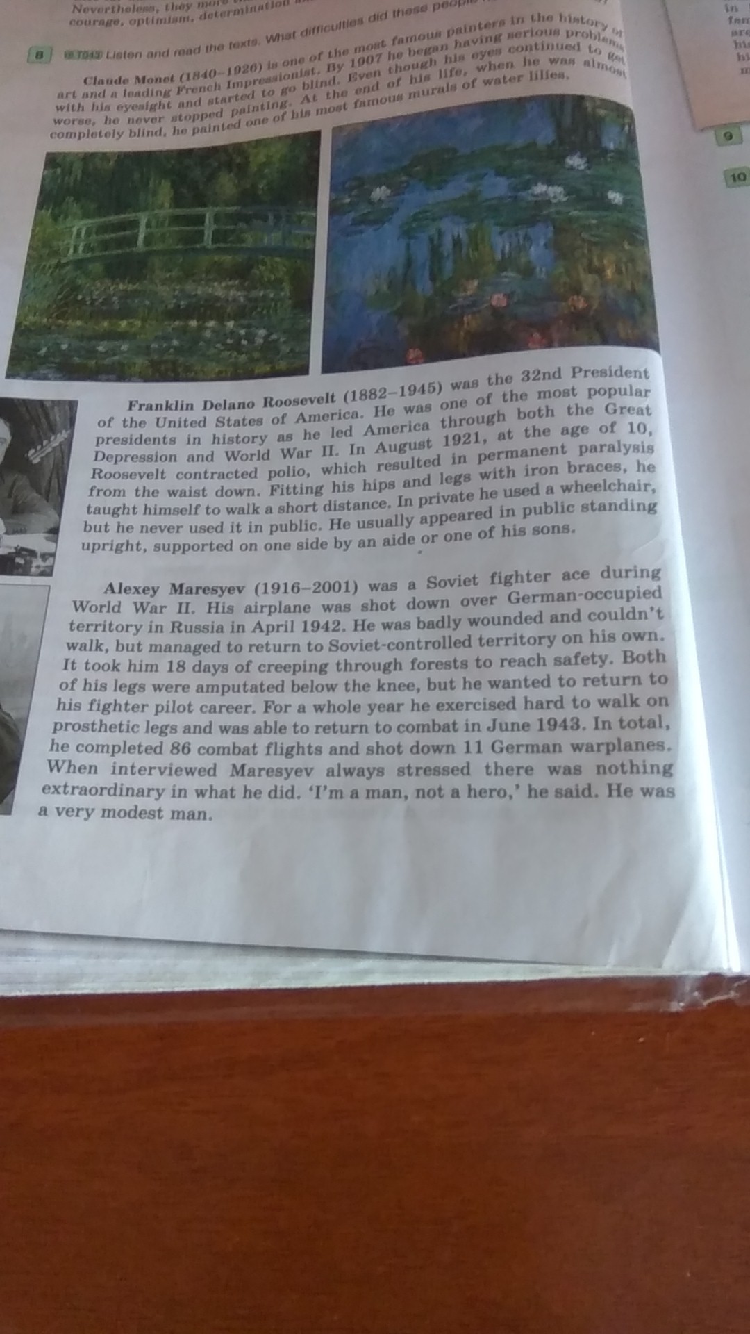 Алексей Маресьев (1916 - 2001) был советским лётчиком-асом во время Второй мировой войны. Его самолёт сбили над окупированной Германией территорией России в апреле 1942 года. Он был тяжело ранен и не мог ходить, но смог самостоятельно вернуться на подконтрольную Советсткому союзу территорию. Чтобы добраться до безопасного места, ему пришлось 18 дней ползти через леса. Обе его ноги были ампутированы ниже колена, но он хотел вернуться к своей работе лётчика-истребителя. Целый год он усердно упражнялся в хождении на протезах и смог вернуться в бой в июне 1943 года. В общем он совершил 86 боевых полётов и сбил 11 немецких военных самолётов. Во время интервью Маресьев всегда подчёркивал, что в том, что он сделал, не было ничего экстраординарного. "Я человек, а не герой", - говорил он. Он был очень скромным человеком.