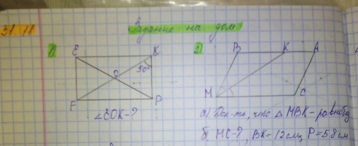 1. Треугольник KOP-равнобедренный, т.к. по свойствам прямоугольника его диагонали равны и точкой пересечения делятся пополам. У равнобедренного треугольника углы при основании равны, значит, ∠ОКР=∠ОРК=50°, следовательно, оставшийся угол КОР равен 180-50-50=80°. Т.к. углы ∠КОР=∠EOF=80°, то ∠ЕОК=∠FOP=(360-80*2)/2=100°