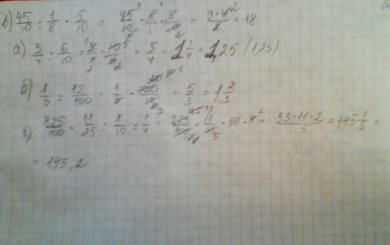 вычислите ,преоброзовав обыкновенную дробь в десяичную дробь: а) 3/4:0,6 б)1/5:0,12 в)4,5:1/8*0,5 г) 8,25*11/25:0,1:1/4
