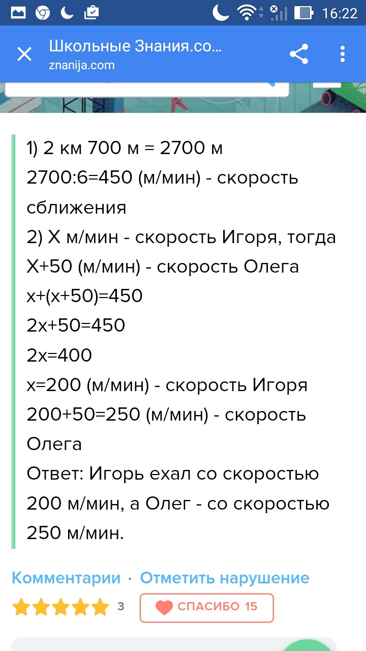 На расстоянии 2 км 700 м от дачного посёлка находится пруд.Игорь от пруда,а Олег от посёлка выезжают на велосипедах одновременно навстречу друг другу и встречаются через 6 минут.Найди скорость,с которой ехал каждый из них,если скорость олега на 50м/мин больше скорости Игоря.