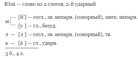 ю—[й’]— согл., зв. непарн. (сонорный), мягк. непарн.[у]— гл., безуд.л—[л]— согл., зв. непарн. (сонорный), тв.а—[а´]— гл., ударн.3 б., 4 з.