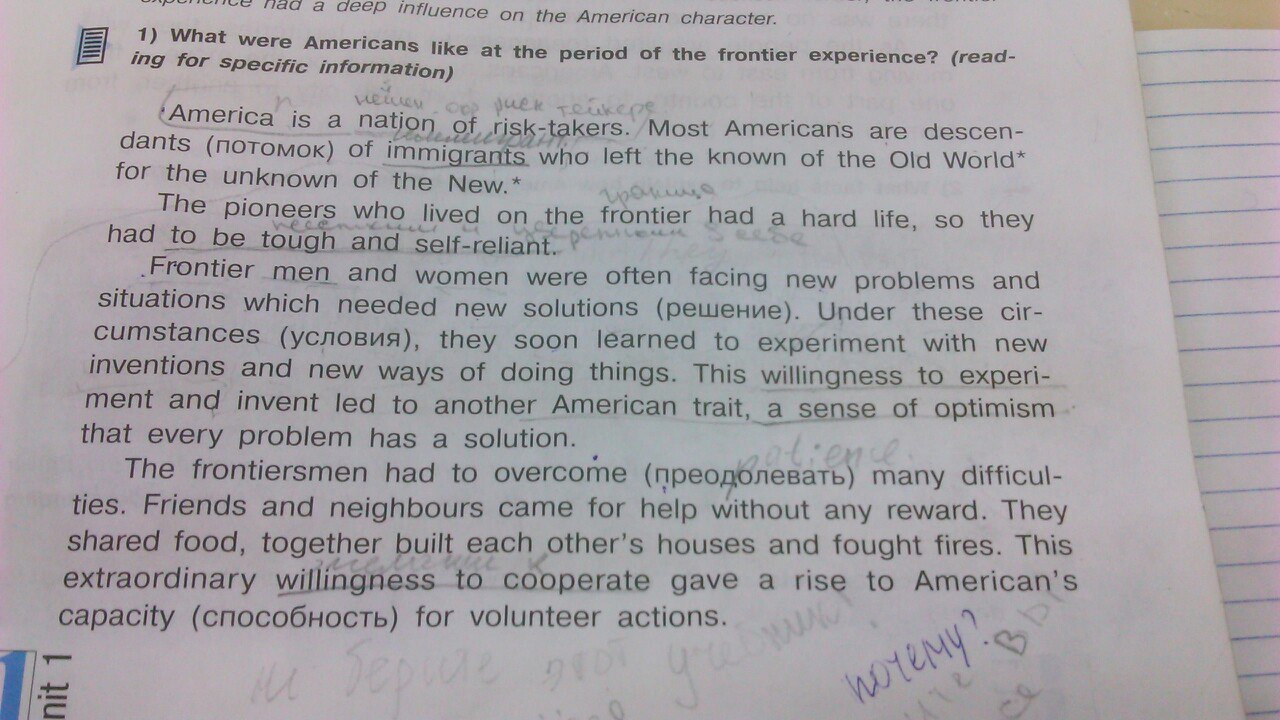 1) Америка любителей риска. Большинство американцев descen из dants (ПОТ иммигрантов, которые покинули известный старого мира для неизвестность Нового Пионеры, которые жили границы была тяжелая жизнь, поэтому они на должны были быть жестким и самодостаточными. Пограничные мужчины и женщины часто сталкиваются с новыми проблемами и ситуациями, которые необходимы новые решения () Решение. в этих обстоятельствах () Условия, вскоре они научились экспериментировать с новыми изобретениями и новые способы ведения дел. Эта готовность Experi среды и изобретают привела к другому Американская черта, чувство оптимизма, что каждая проблема имеет решение The пограничниками пришлось преодолеть (преодолевать) многие трудности. Друзья и соседи пришли на помощь без какого-либо вознаграждения. Они делили еду, вместе строили дома и сразился пожары друг друга. Это необыкновенный готовность к сотрудничеству дала начало способности американца с (для) Способность добровольцев действий