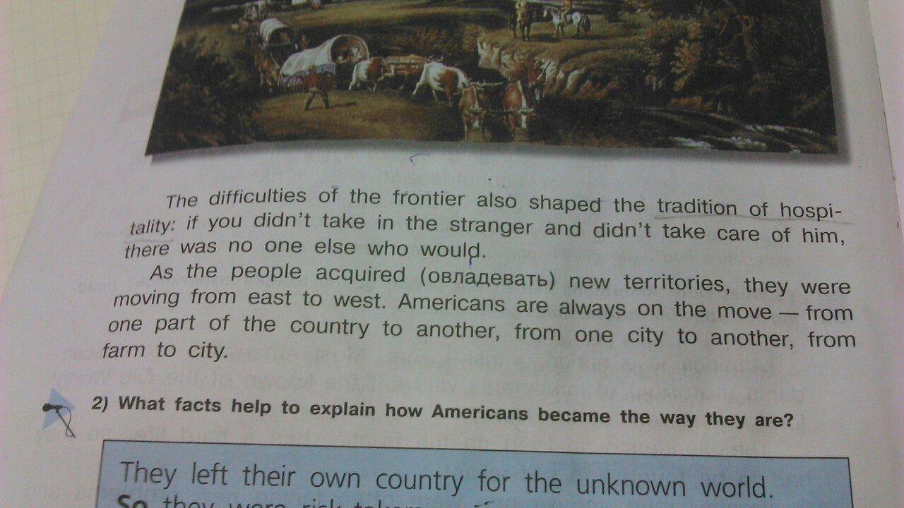 2) Трудности границы также сформировали традицию hospi- ствиях; если вы не брали в незнакомца и не заботиться о нем не было никого, кто был бы. По мере того как люди приобрели новые территории, они двигались с востока на запад. Американцы всегда в движении из одной части страны в другую, из одного города в другой, от фермы до города.