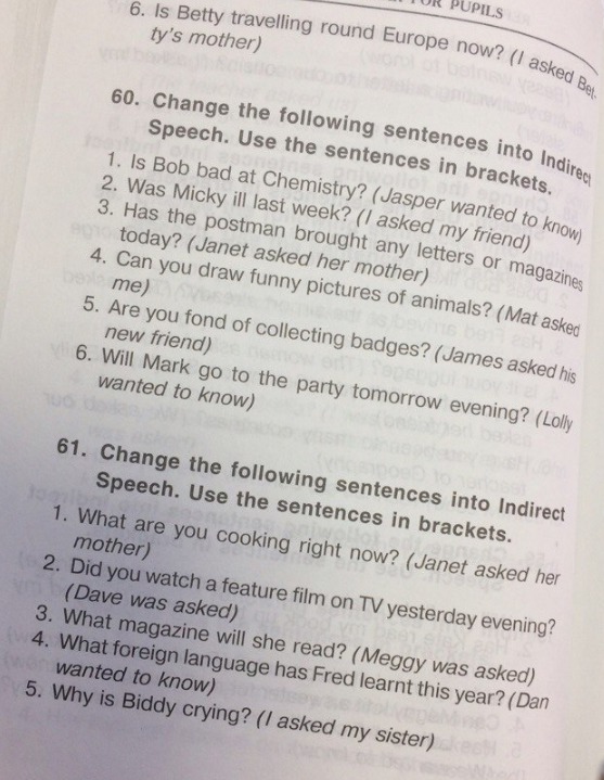 61. Janet asked her mother what she was cooking at that moment; Dave was asked if he had watched a feature film on TV the evening before; Meggy was asked what magazine she would read; Dan wanted to know what foreign language Fred had learnt that year; I asked my sister why Biddy was crying