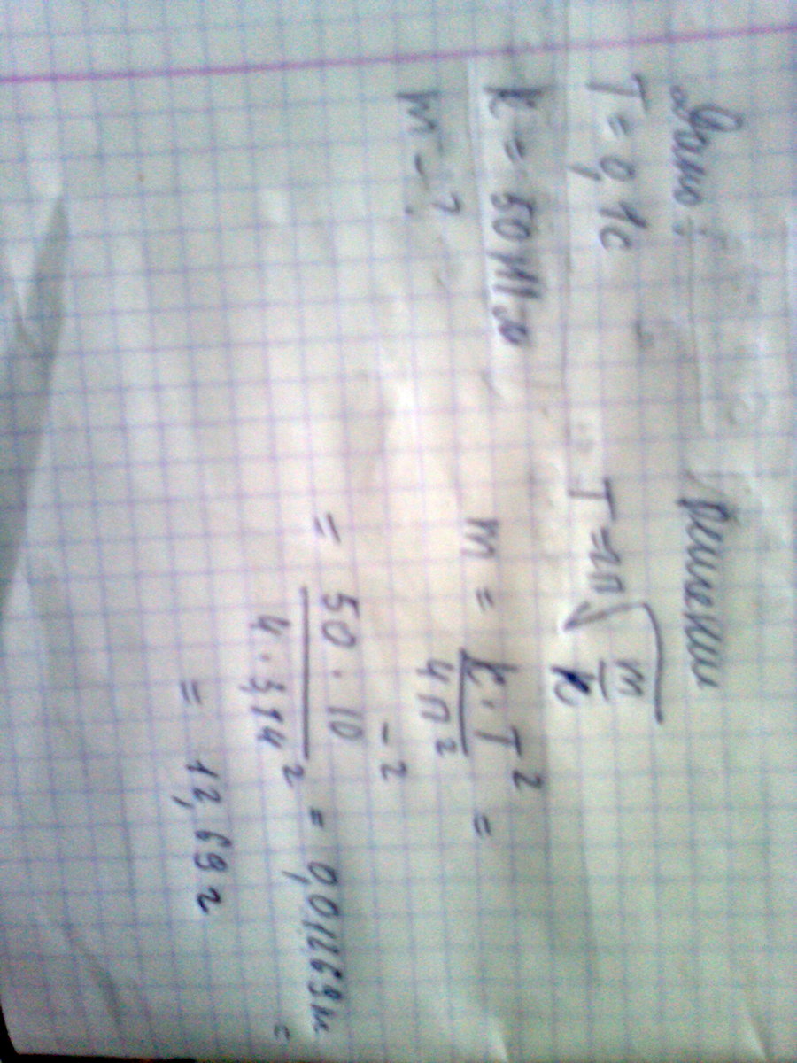 какова масса груза подвешенного на пружине ,если период его колебаний 0,1с ,а жесткость пружины 50н/м