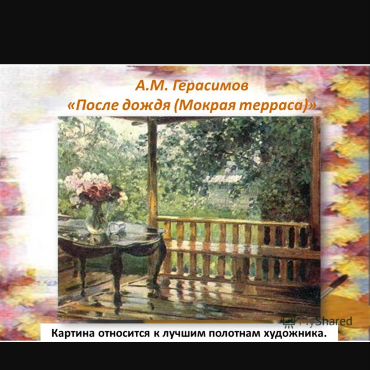 В ...году А.М.Герасимов написал картину После дождя. На переднем плане мы видим изящный столик .А на нём стоит ваза с красивыми цветами. Мне так и хочется перенестись туда, на эту деревянную трассу!А в далеке маленький беленький домик закрытый листвой деревьев.