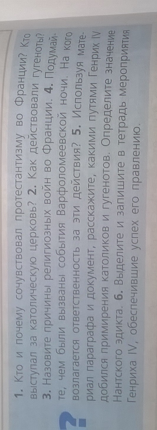 4) Король пытался навести порядок, но солдаты и городская милиция смешивались с простонародьем, убивая даже тех, кого король брал под защиту. Первоначально правительство пыталось объяснить происходящее враждой Гизов и Колиньи, но 26 августа Карл IX официально заявил, что все произошло по его приказу.В такой обстановке Екатерине Медичи удалось убедить короля в необходимости устранить наиболее опасных гугенотов, чтобы избежать новой гражданской войны. 5) Генрих 4 ввел Нантский эдикт, в котором указано, что всем людям, придерживающимся названной религии, можно продолжать исповедовать её во всех городах и подчиненных им местах, где она была введена.Так же он сделал так, чтобы не было никакого различия в отношении названной религии при приеме учениковв в университеты, школы, и т.п. Это лишь несколько пунктов из Нантского эдикта. Именно благодаря этому эдикту, введенному Генрихом IV в 1598г., гугеноты стали иметь равные права с католиками, и это несколько упростило жизнь всем. Но если разобраться получше, то на самом деле он не добился примерения, а просто заключил временное перемирие.6) 1. Укрепление протестантской веры. 2. Поощрение и развитие национальной промышленности.
