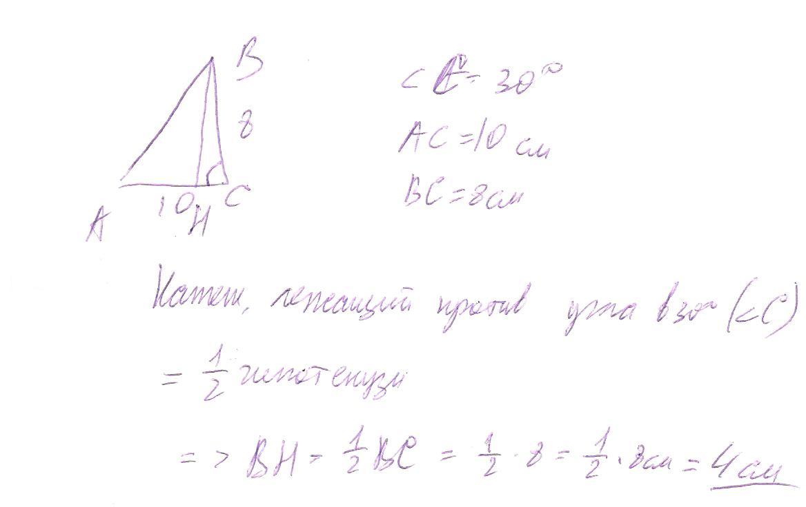 Дано: треугольник ABC, угол С=30 градусов, AC=10 cм, BC=8 cм.
