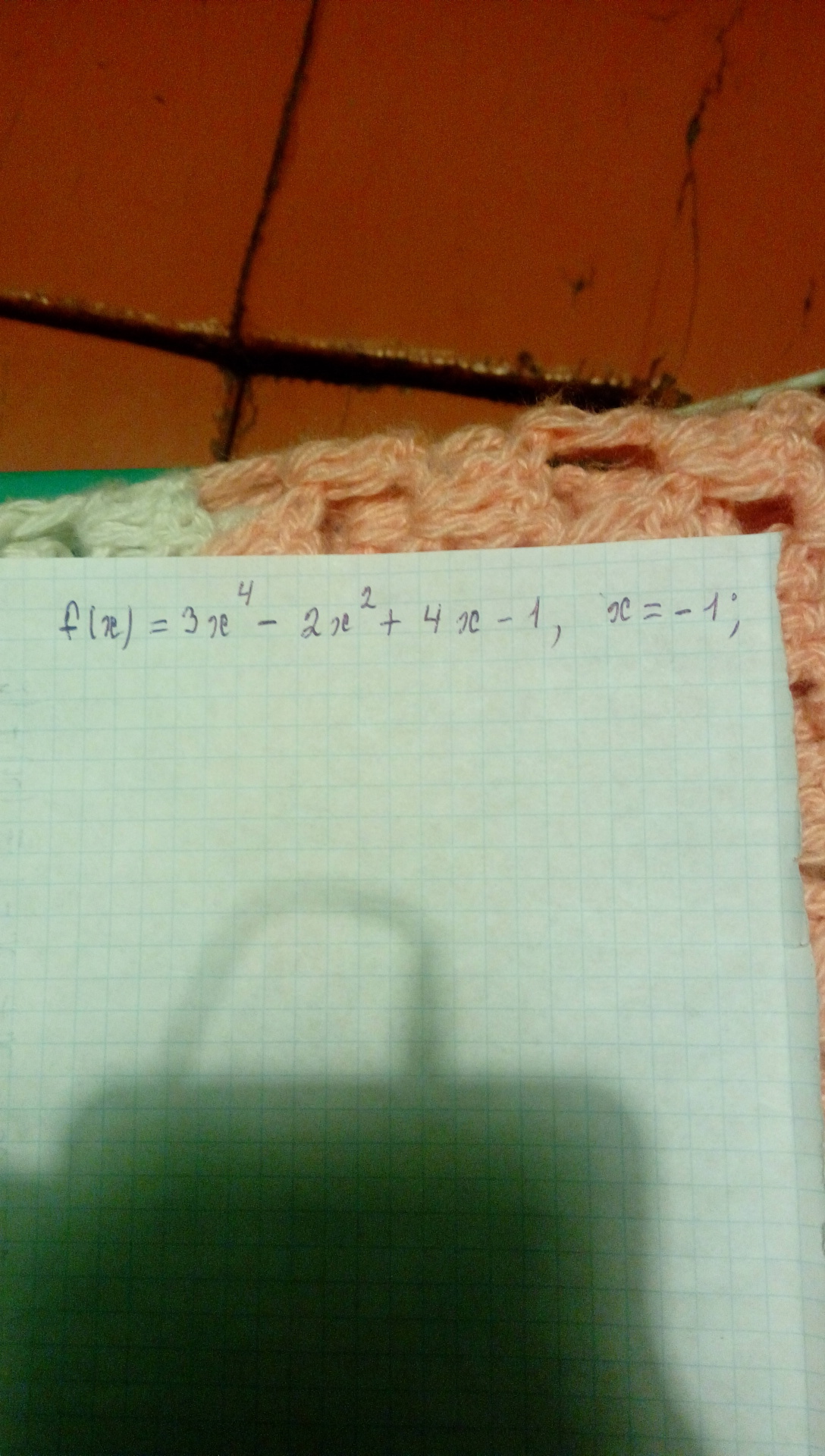 F'(x)=12*x^3 - 4*x +4. теперь подтавляем значение (-1) вместо икс и считаем. 12*(-1)^3 - 4*(-1) +4 =-4