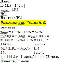 Какое количество вещества (моль) водорода выделится при взаимодействии магния массой 140 г, содержащего 18% примесей с соляной кислотой?