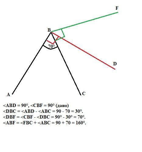 Из вершины ABC, равного 70°, проведите лучи ВD и BF так, что BD_|_ BA, BF_|_BC, лучи BD и BC пренадлежат углу ABF. Найдите углы DBF и ABF.