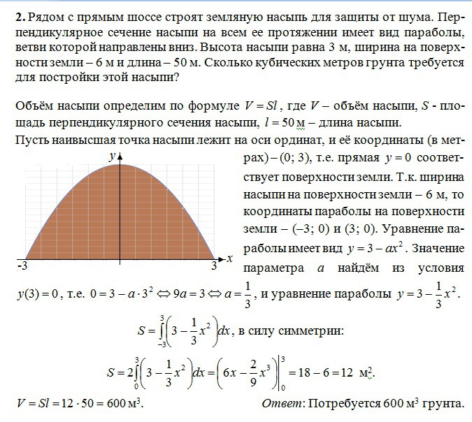 Рядом с прямым шоссе строят земляную насыпь для защиты от шума. Перпендикулярное сечение насыпи на всем ее протяжении имеет вид параболы, ветви которой направлены вниз. Высота насыпи равна 3 м , ширина на поверхности земли - 6 м и длина - 50 м . Сколько кубических метров грунта требуется для постройки этой насыпи ?