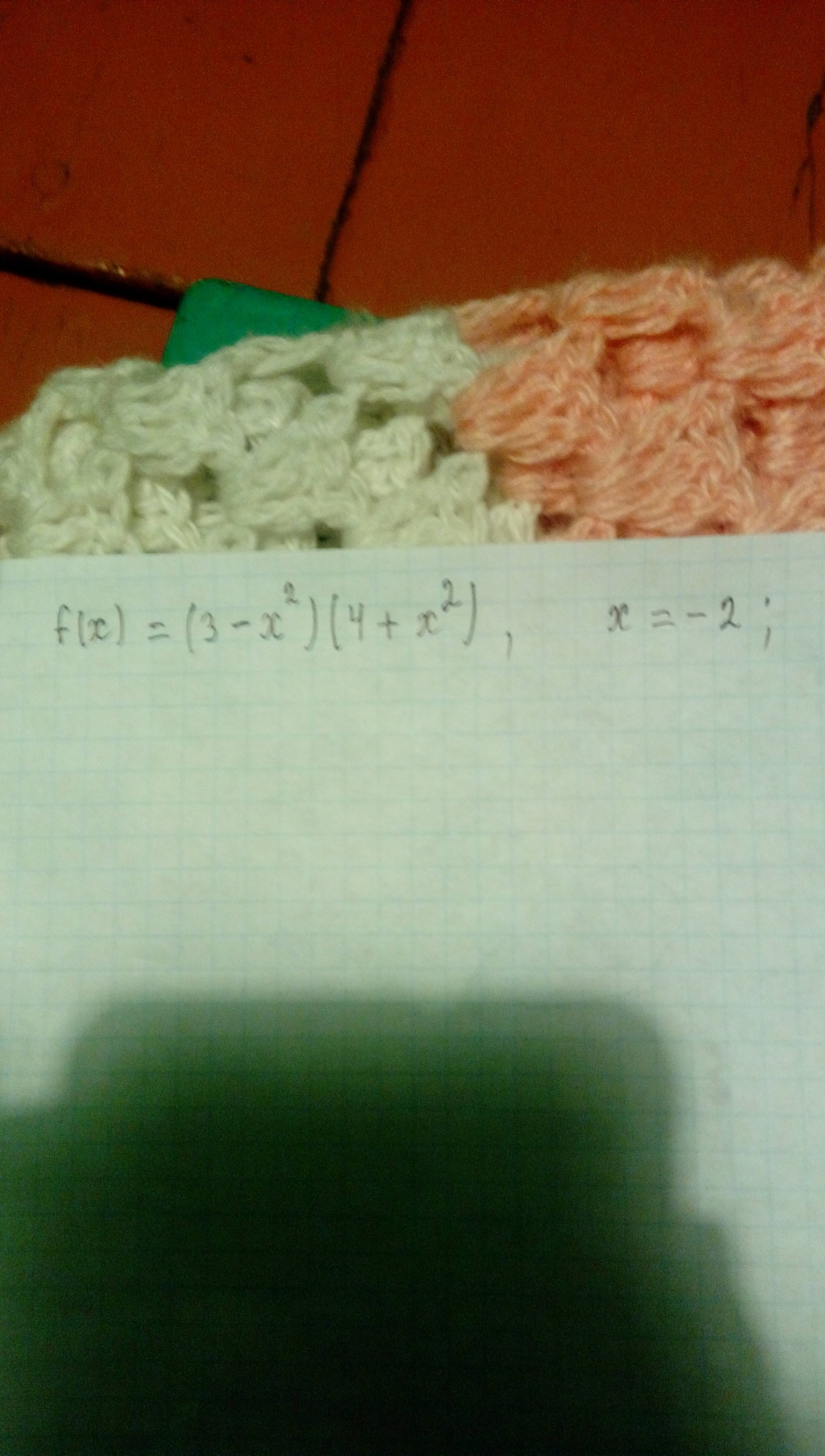 f′(x)=((3−x⋅2)⋅(4+x⋅2))′=(3−x⋅2)′⋅(4+x⋅2)+(3−x⋅2)⋅(4+x⋅2)′=(−(x⋅2)′)⋅(4+x⋅2)+(3−x⋅2)⋅(x⋅2)′=(−2)⋅(4+x⋅2)+(3−x⋅2)⋅2