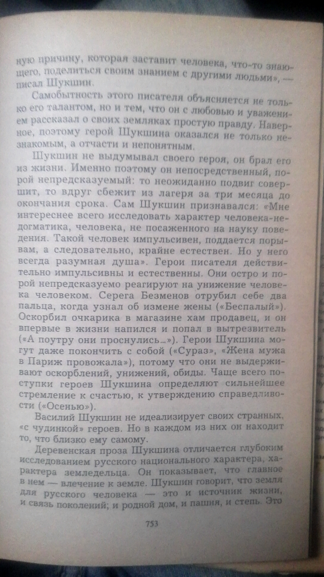 И как говорил сам Шукшин,его интересовала одна тема:судьба русского крестьянства.Память,размышления о жизни всегда приводили писателя в село,где он видел "острейшие схлесты и конфликты"."Сама потребность взяться за перо лежит,думаю,в душе растревоженной.Трудно найти другую такую побудительную причину,которая заставит человека,что-то знающегр,поделиться своим знанием с другими людьми",-писал Шукшин.