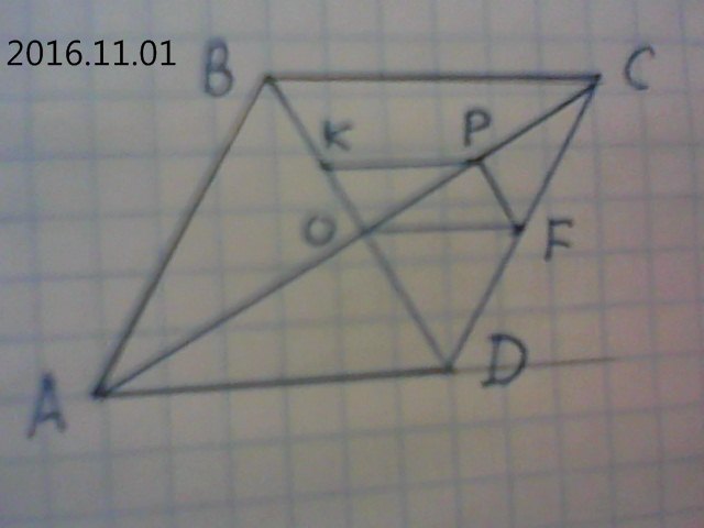 в ромбе ABCD диагонали пересекаются в точке О. AB=BD. Точки F. P. K- середины отрезков CD. OC. OB соответственно. Вычислите периметр четырехугольника OKPF. если периметр ромба равен 32 см