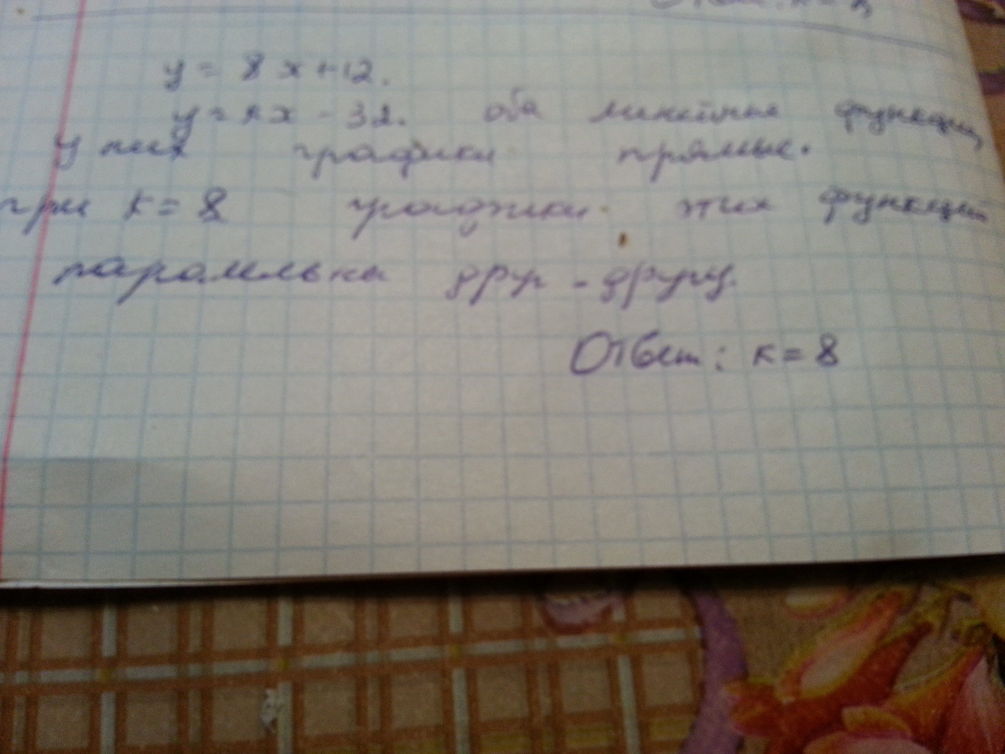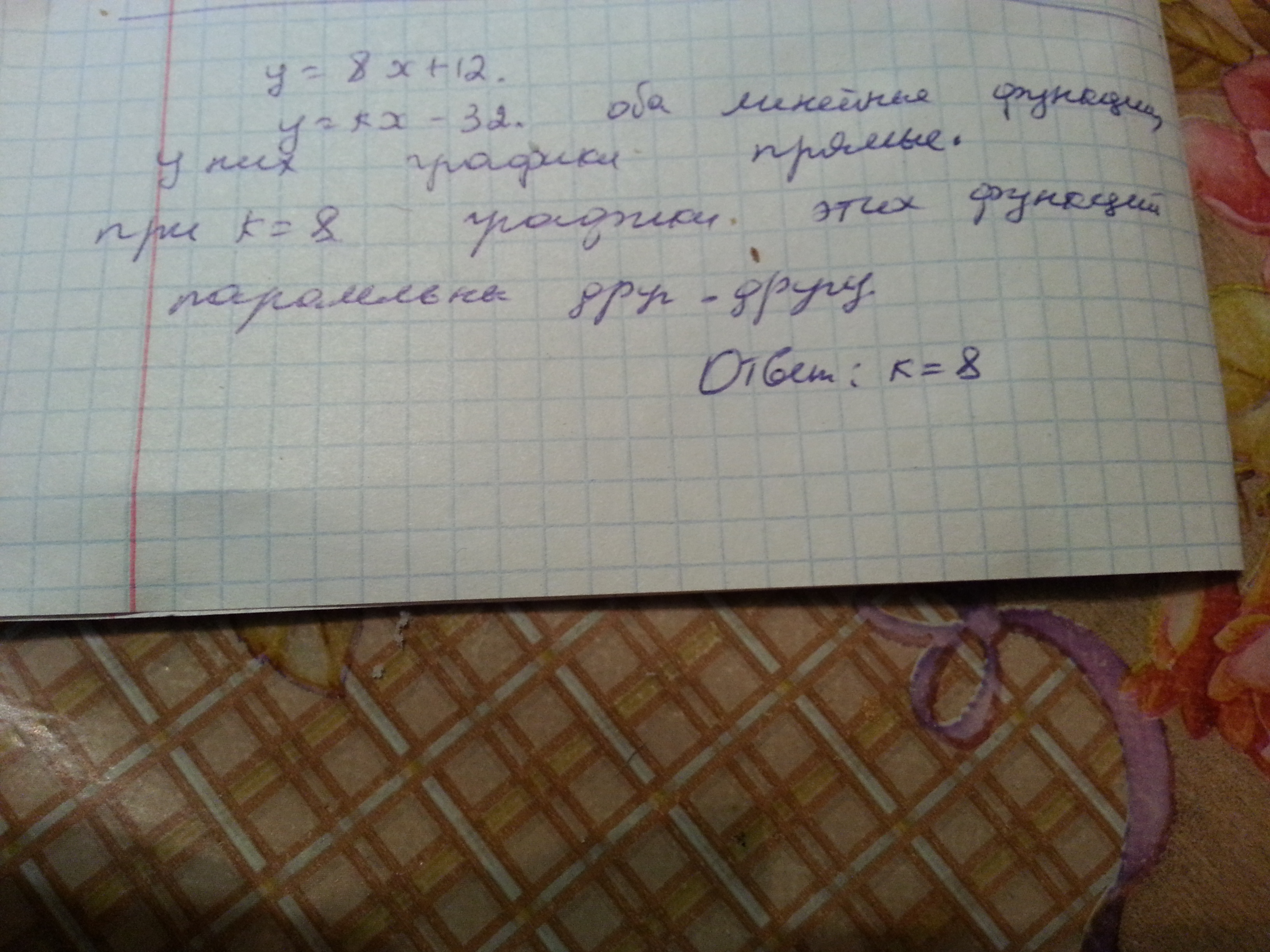Какое число нужно подставить вместо K, чтобы график заданный линейных функций были параллельны: y=8x+12 и k x-3?