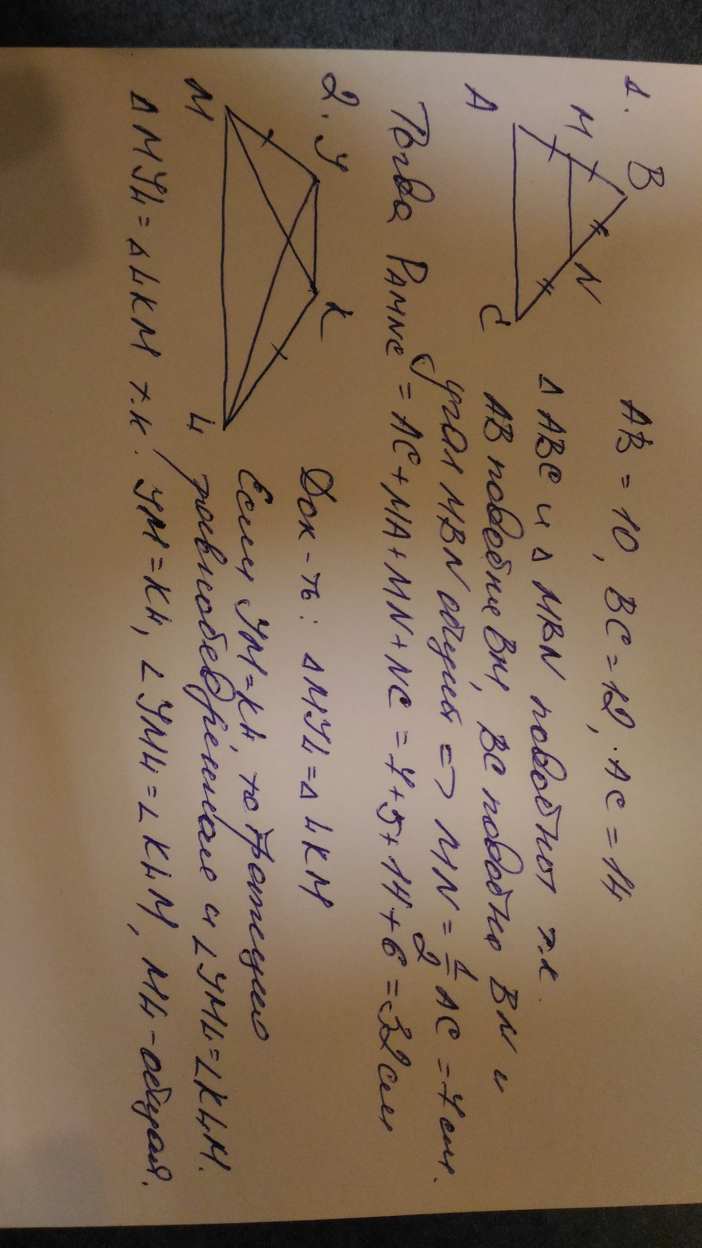 1) MN - средняя линия треугольника ABC. Найдите периметр трапеции ABCD, если АВ=10 см, ВС=12 см, АС=14 см