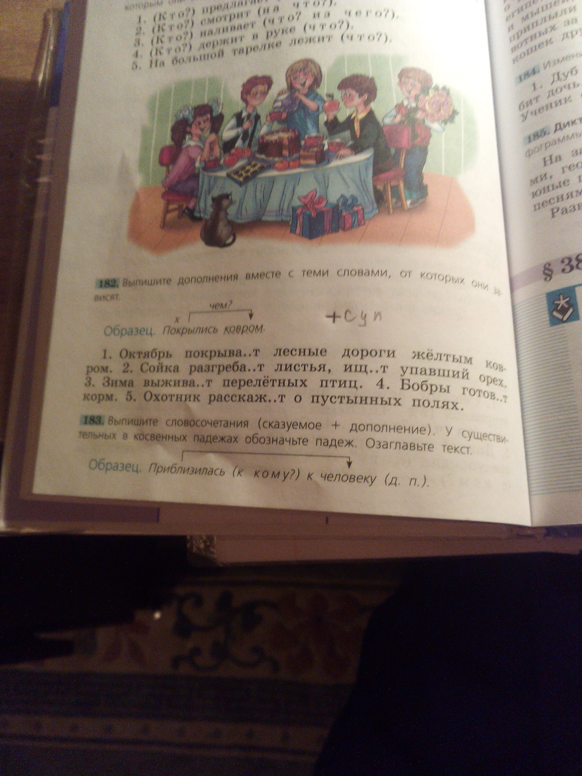 покрывает (что?) дороги, разгребает (что?) листья, ищет (что?) орех, выживает (кого?) птиц, готовят (что?) корм, расскажет (о чем?) о полях