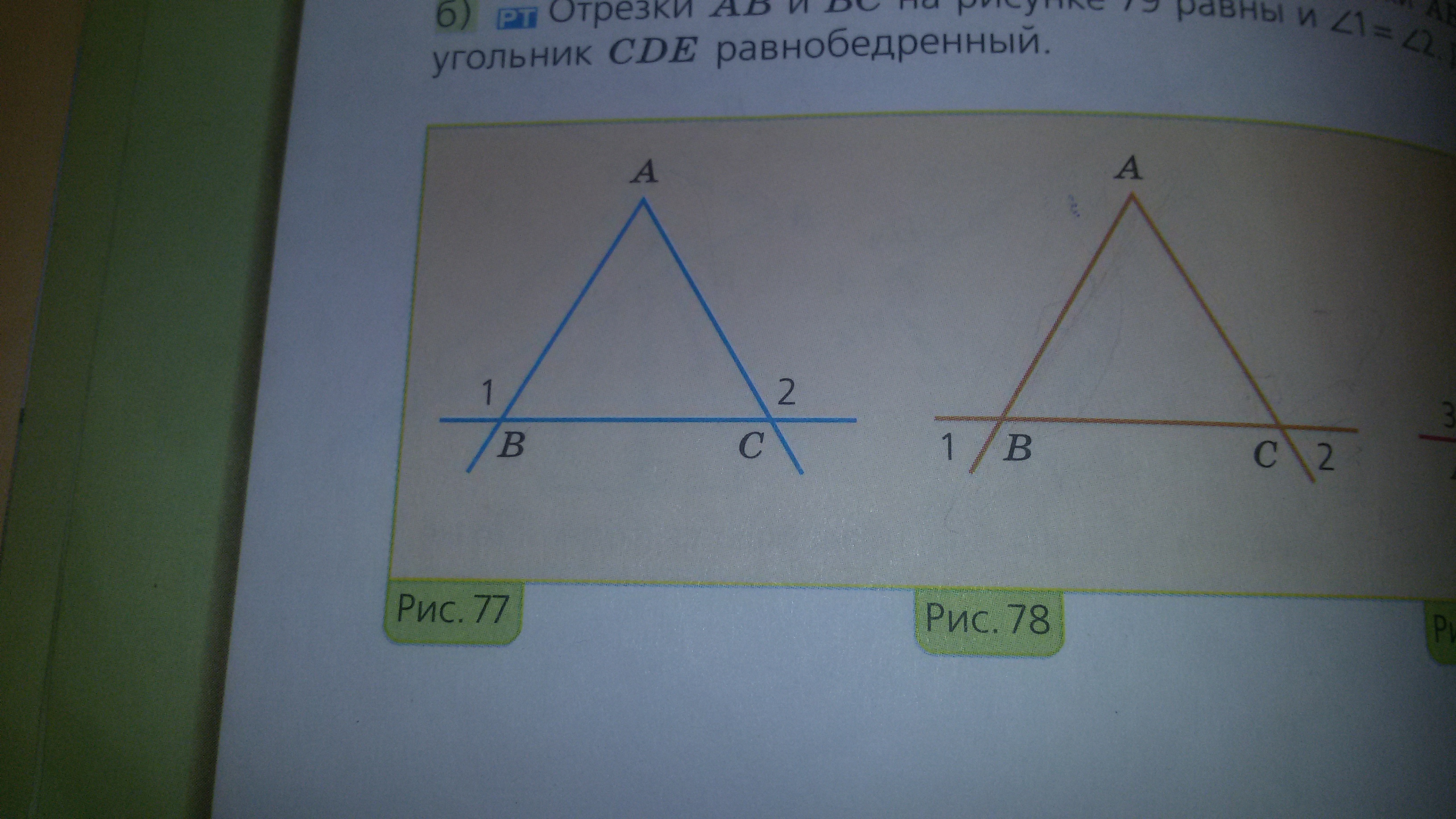 Отрезки AB и AC на рисунке 79 равны и ∠1=∠2. Докажите,что треугольник CDE равнобедренный.
