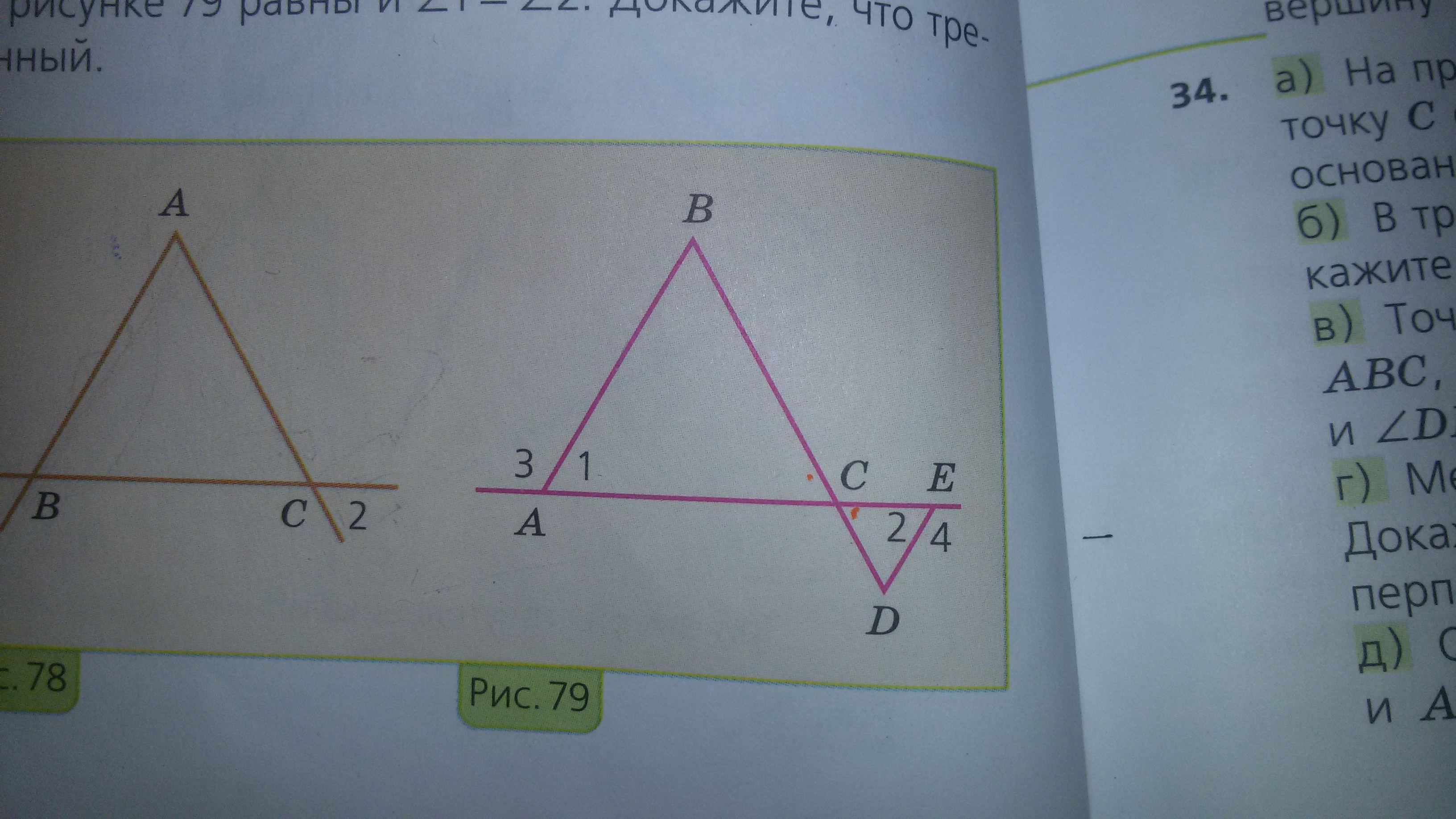 Отрезки AB и BC на рисунке 79 равны и угол 1 = углу 2. Докажите,что треугольник CDE равнобедренный.